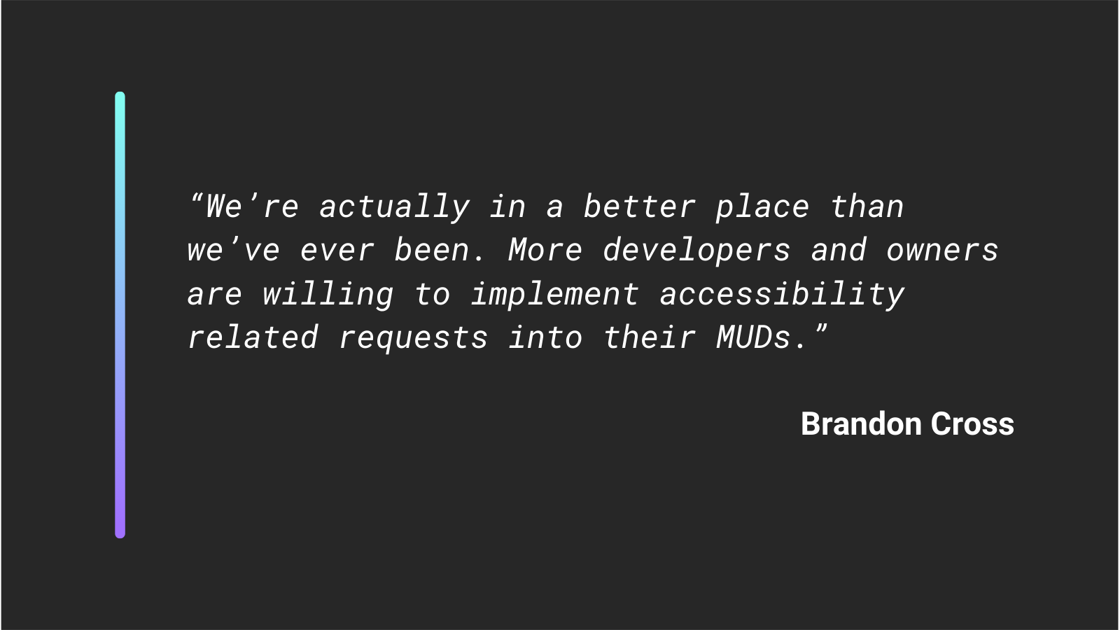 First: “Every MUD should have an accessibility or screen reader mode.”