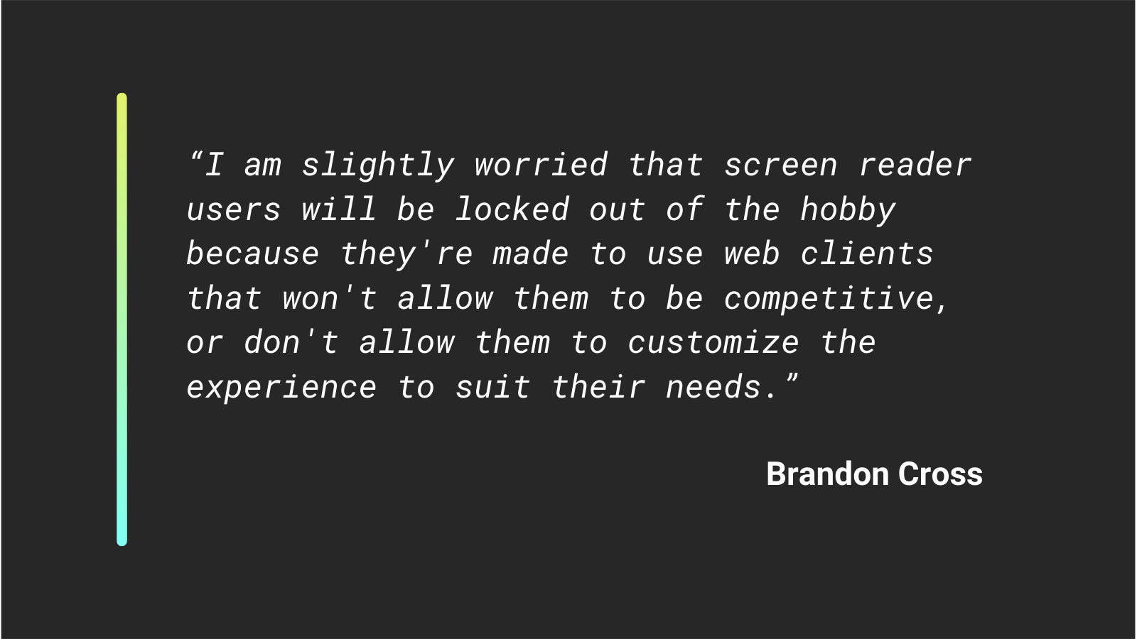 “I don’t think that’s a bad thing, but I am slightly worried that screen reader users will be locked out of the hobby because they’re made to use web clients that won’t allow them to be competitive, or don’t allow them to customize the experience to suit their needs.”