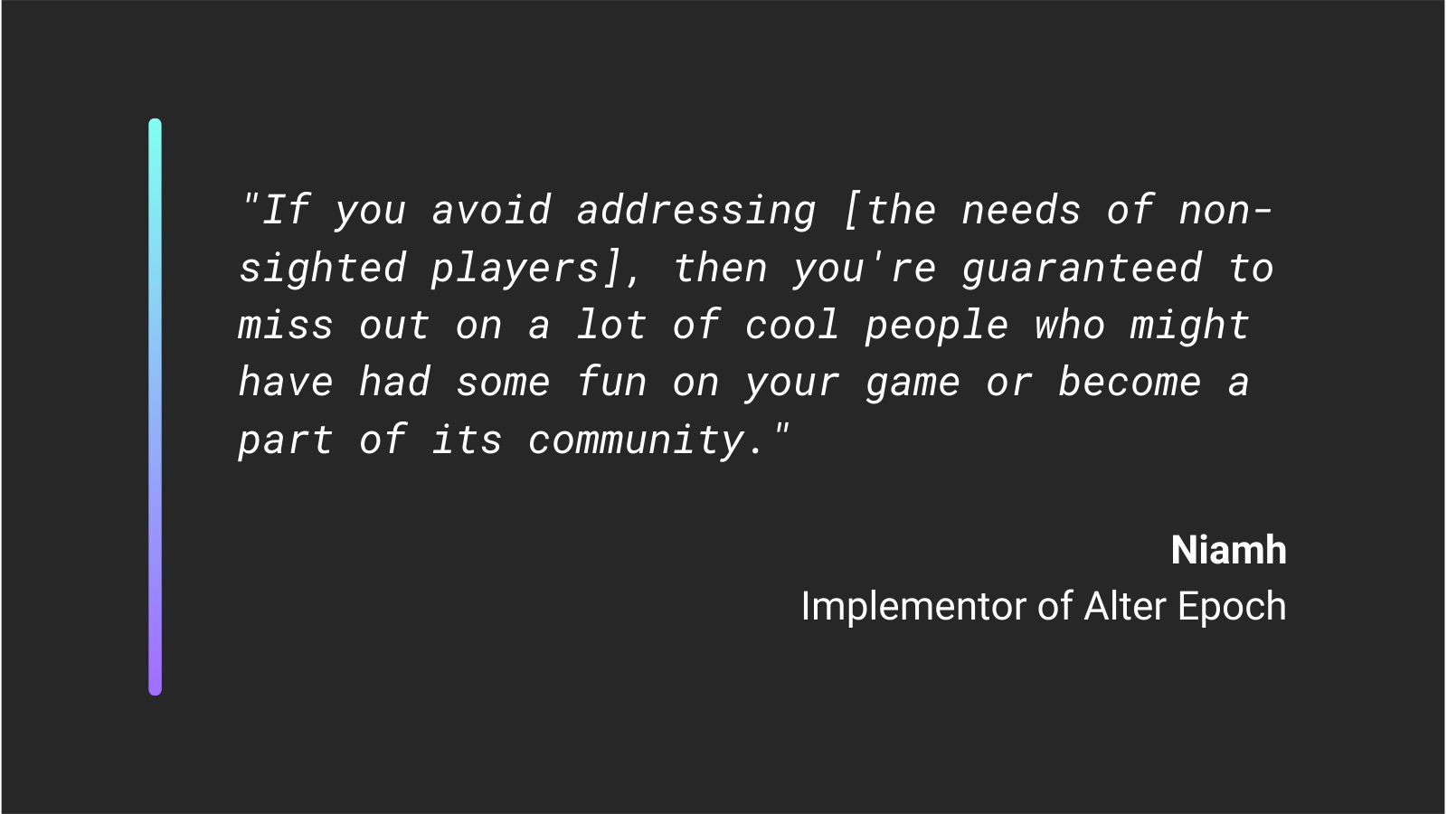 “Definitely talk to players who use screen readers and get their input,” she said.