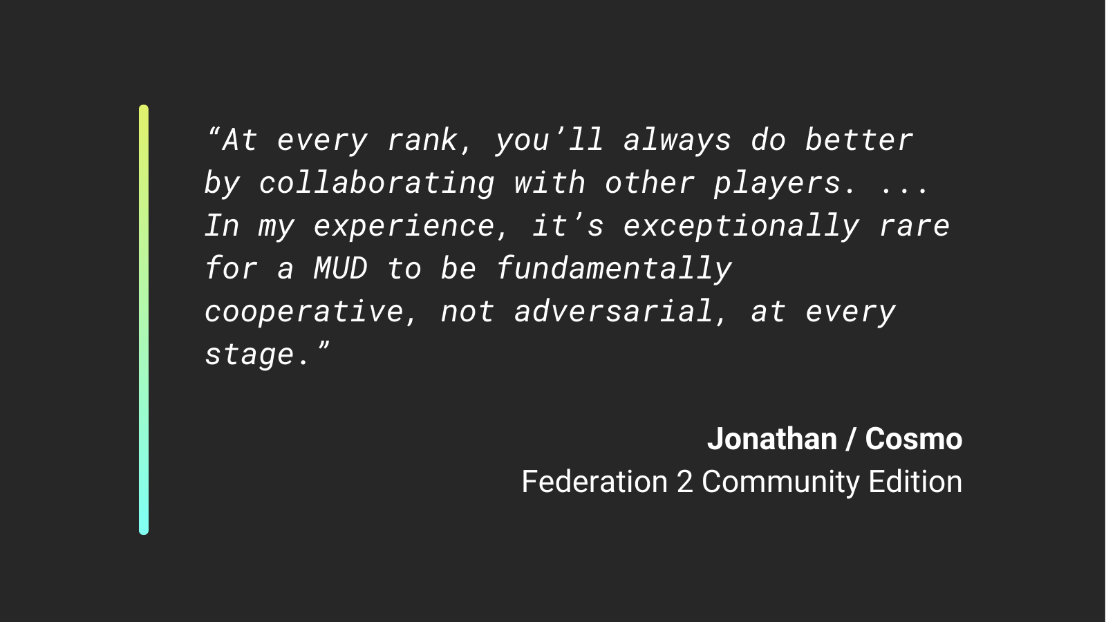It’s not unusual for a MUD to have cooperative mechanics, but Fed2 is different. Cooperation is at the game’s very core.