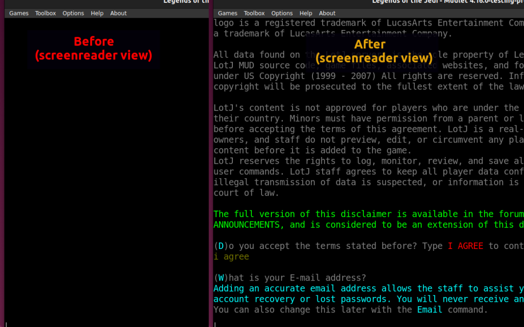 Because of this focus on performance, however, Mudlet’s text renderer wasn’t using any accessibility frameworks.