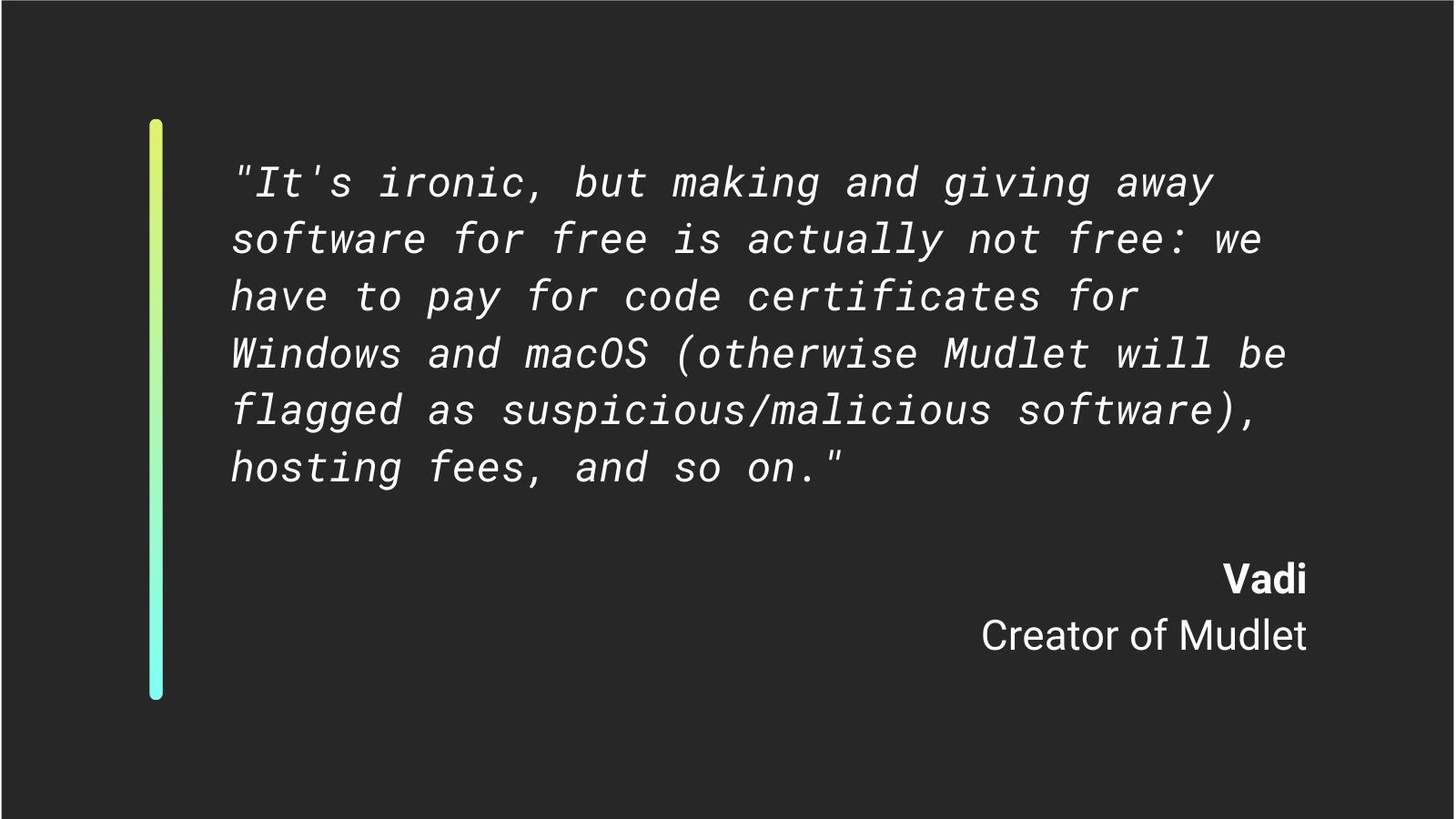 “It’s ironic, but making and giving away software for free is actually not free: we have to pay for code certificates for Windows and macOS (otherwise Mudlet will be flagged as suspicious/malicious software), hosting fees, and so on,” he explained.