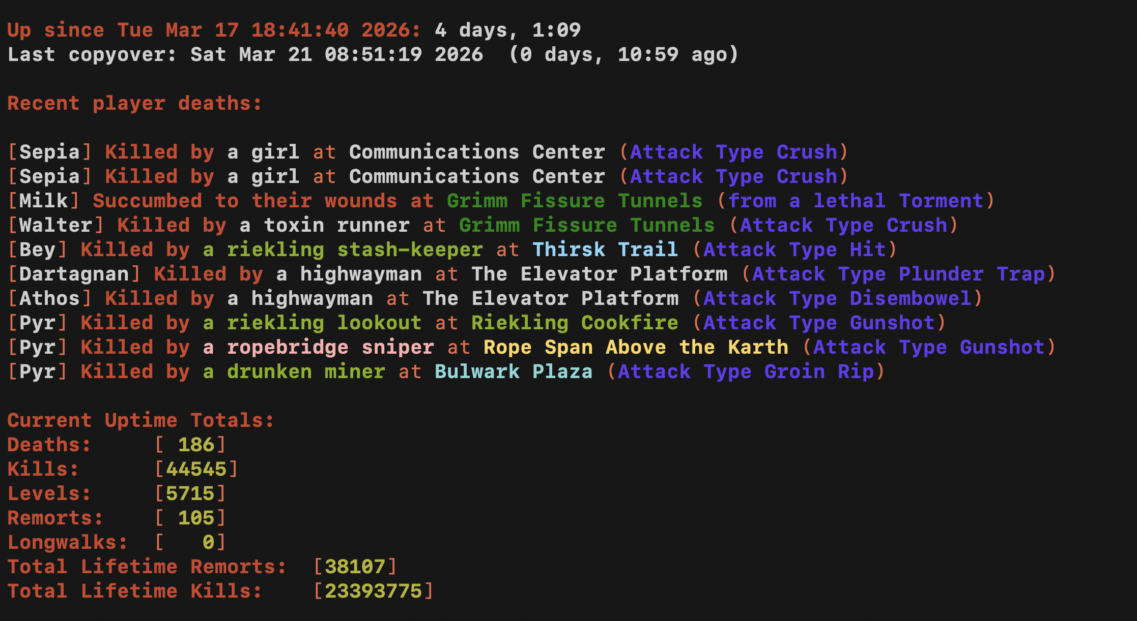 If you’re looking for a hack-and-slash MUD with a cooperative heart and a world that doesn’t take itself too seriously, definitely check it out: visit nukefire.org to learn more and come say hi in the Discord.