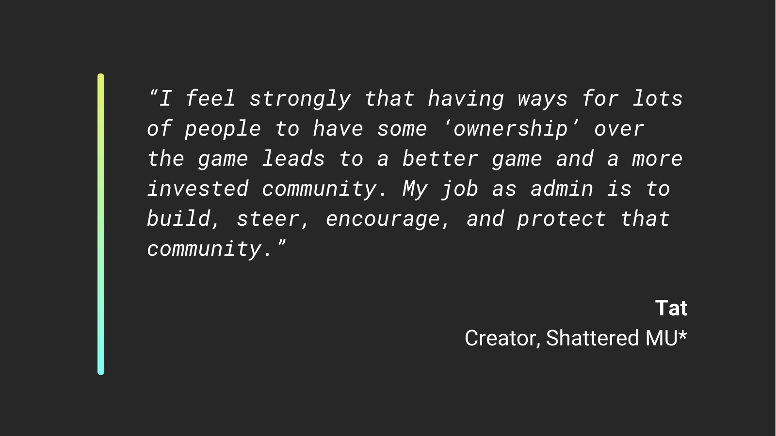 For Tat, her most important job as admin is to build, encourage, steer, and protect that community. Not just the community of staff but the community of the game: