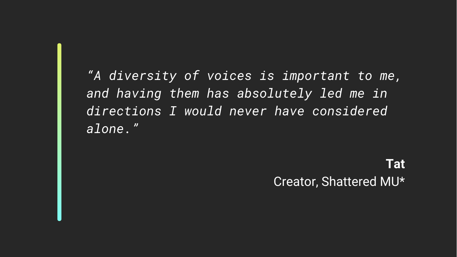 “A diversity of voices is important to me, and having them has absolutely led me in directions I would never have considered alone.”