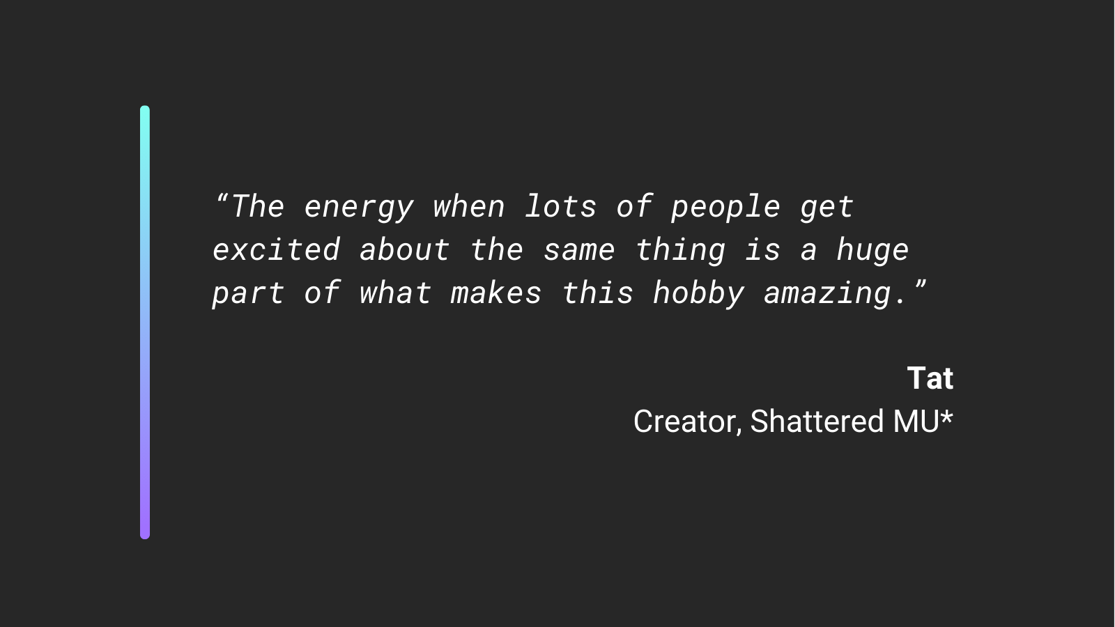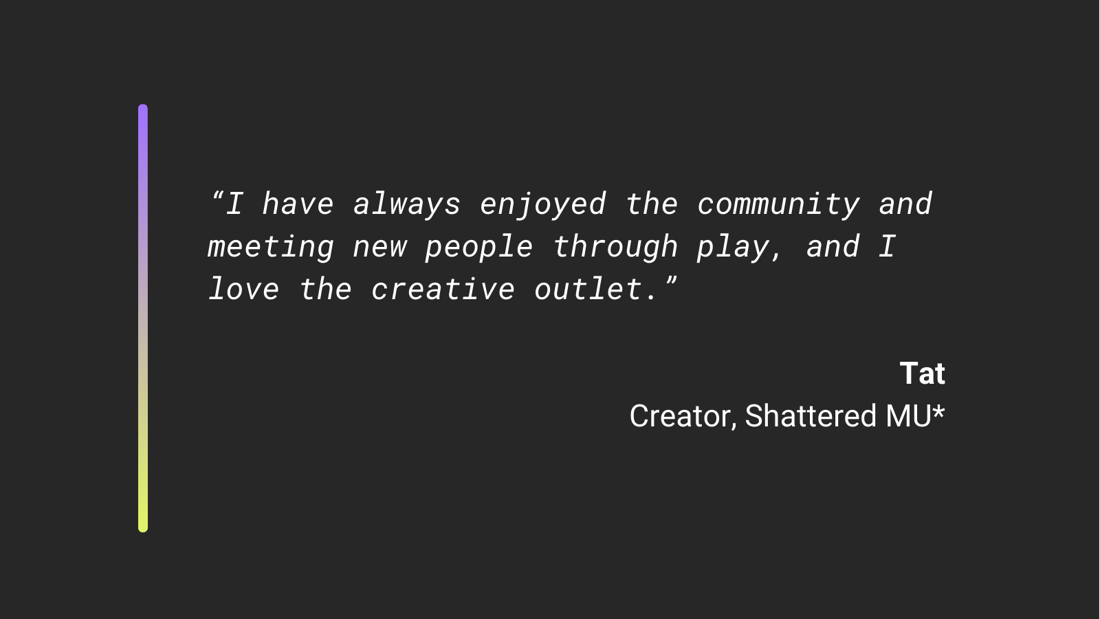 “I’m motivated by a lot of things – the desire to tell stories, the desire to create, the desire to see people enjoy the stuff I’ve built – but I think the biggest one is that when I’m not in a M* community, I miss the people.
