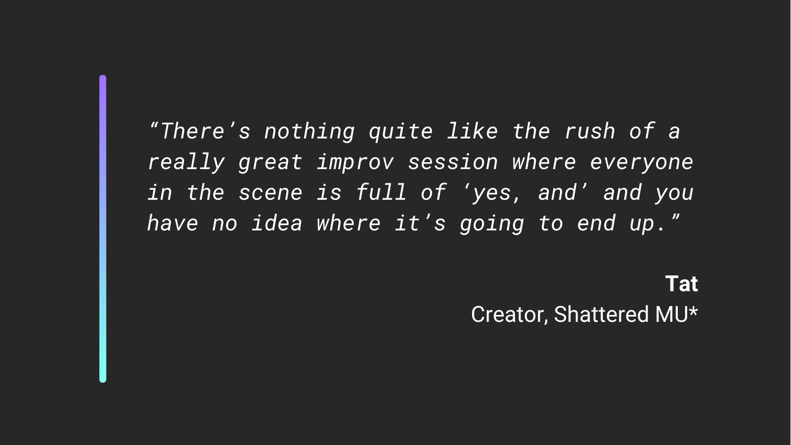 “There’s nothing quite like the rush of a really great improv session where everyone in the scene is full of ‘yes, and’ and you have no idea where it’s going to end up.”